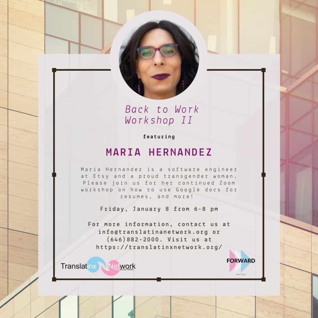 On Friday January 8th 6-8pm, we will be hosting part II of our virtual Back to Work Workshop with Maria Hernandez. Join us to learn more about going back to work using Google docs for resumes and more!