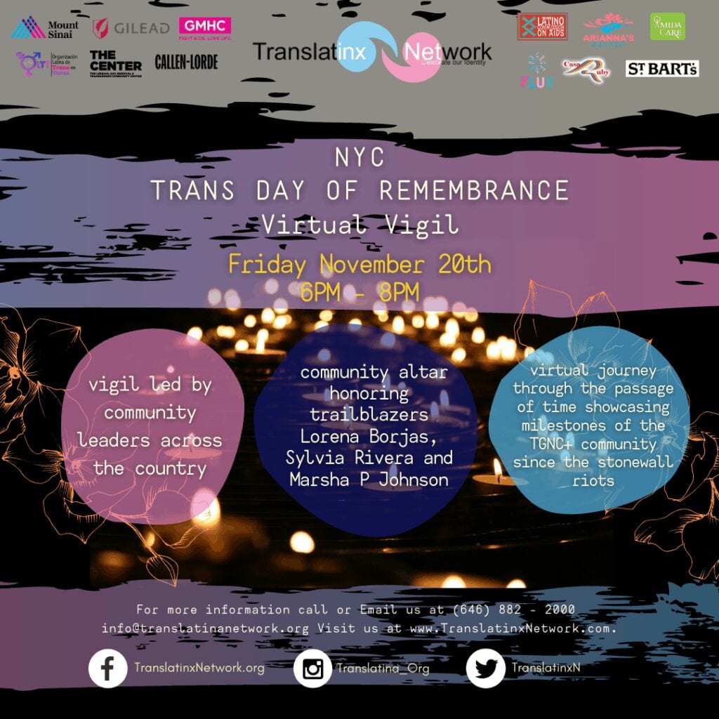 On Friday November 20th 6-8pm, we will be hosting a virtual NYC Transgender Day of Remembrance vigil led by community leaders. It will showcase TGNC+ trailblazers and the passage of time TGNC+ milestones since the Stonewall riots.